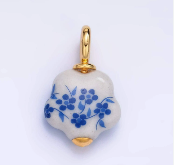 A pretty pair of huggie drop earrings in gold with a blue willow patterned ceramic bead in 14ct gold plated brass with a droplet pearl.